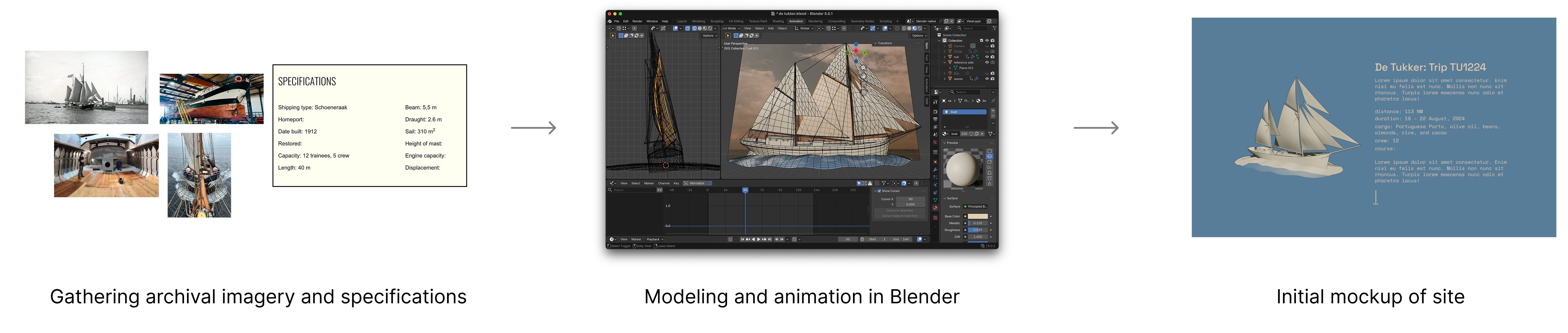 A big challenge was ensuring a small, fast–loading file while retaining the intricate animation of the sails and water. By morphing the model using combinations of cyclical motions, I could keep the the animation loop compact while keeping a random-like effect.